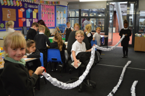Year 1 competed in four teams to build the longest paperchain. They used excellent teamwork to build the chains in sections before putting them all together.